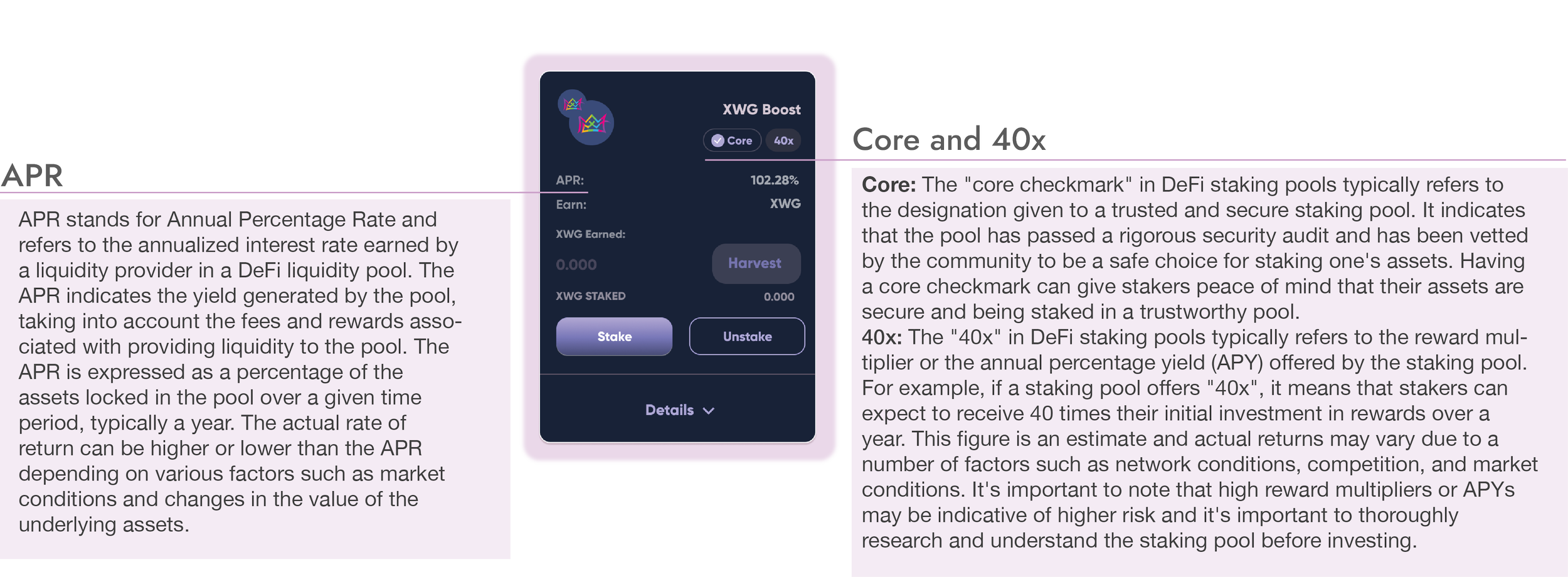 Token and NFT pool. This product had both token and NFT pools. In this page users had access to general financial data and could see how the tokens or NFTs they staked were doing by using the toggle “staked only”.